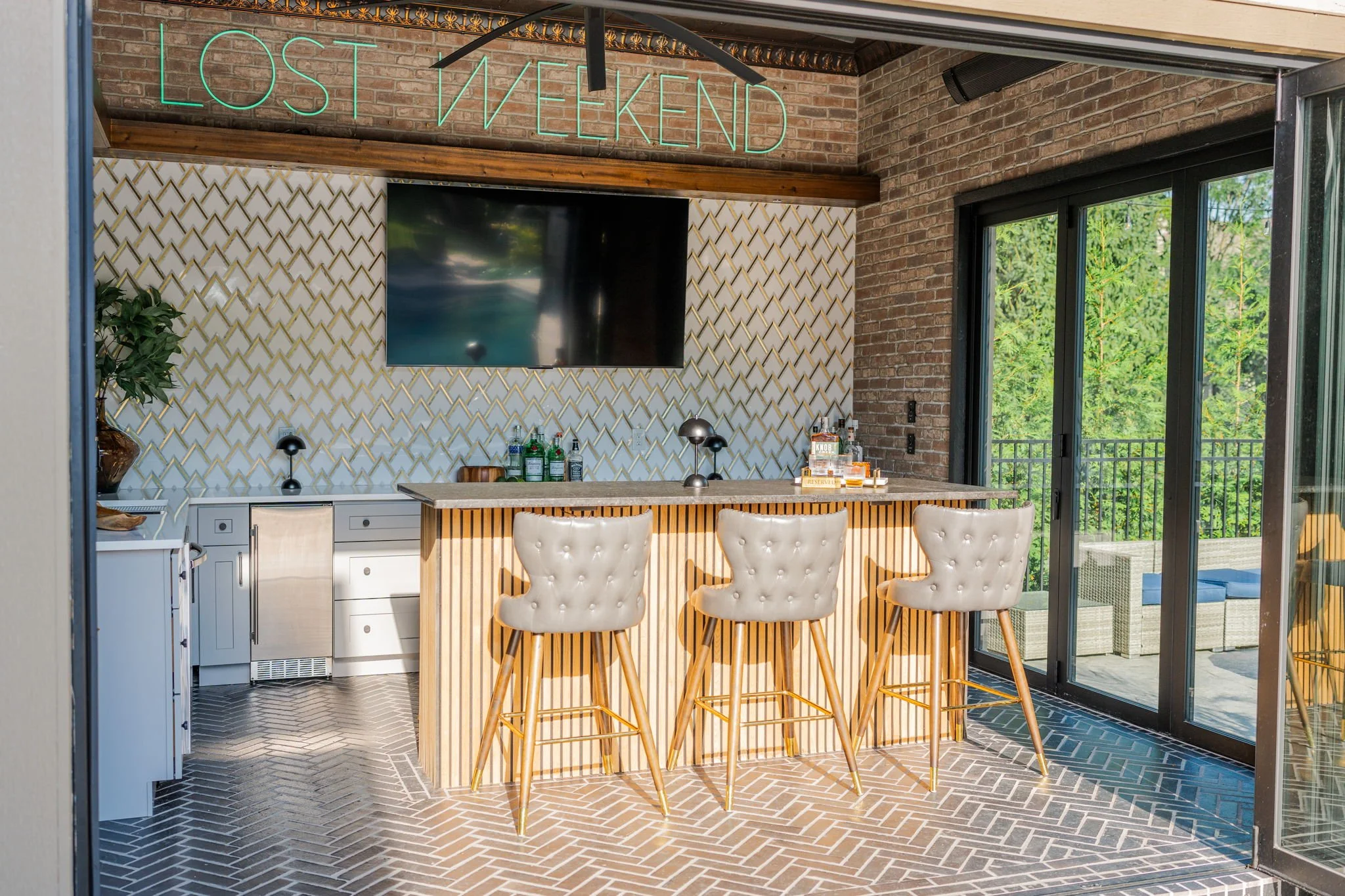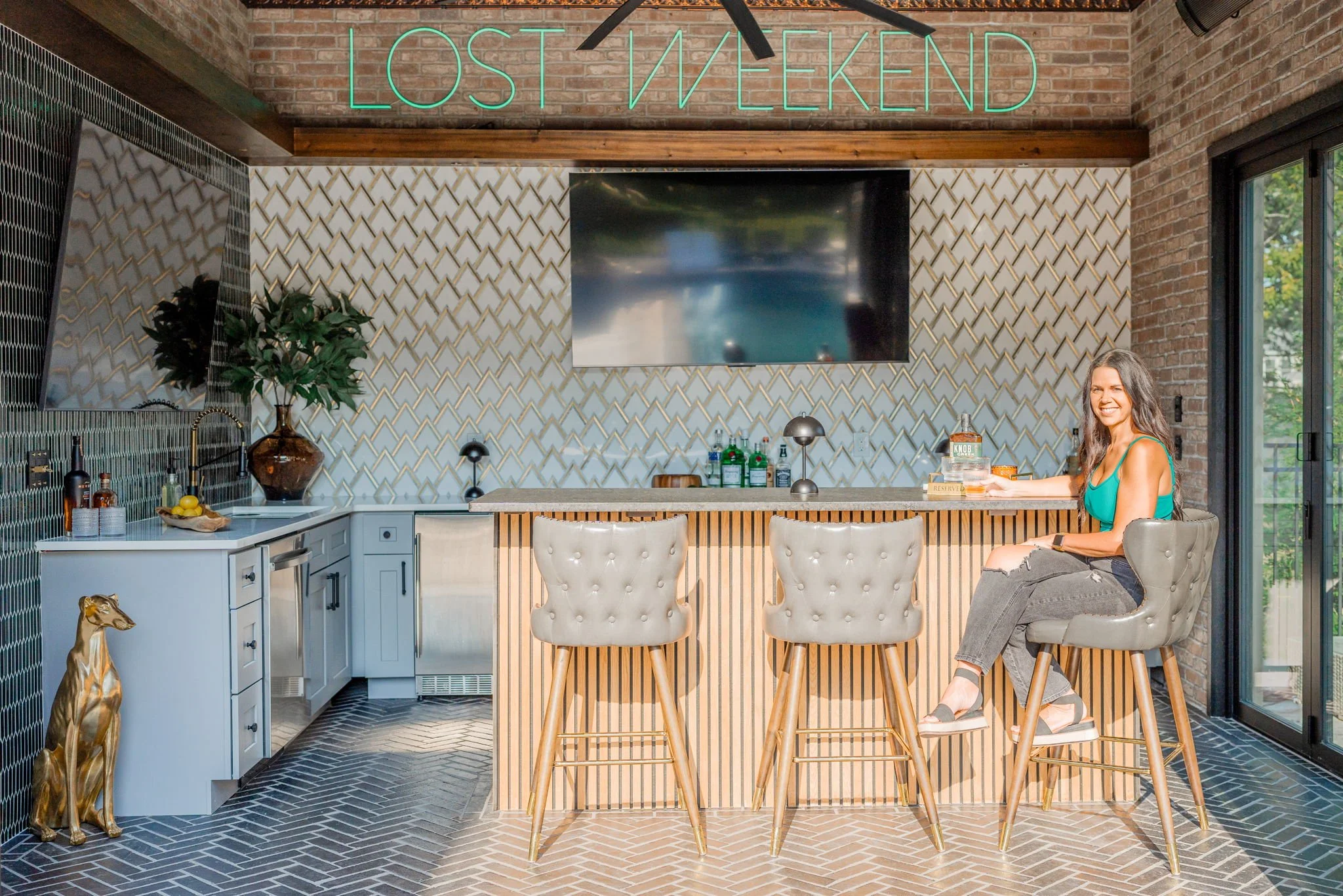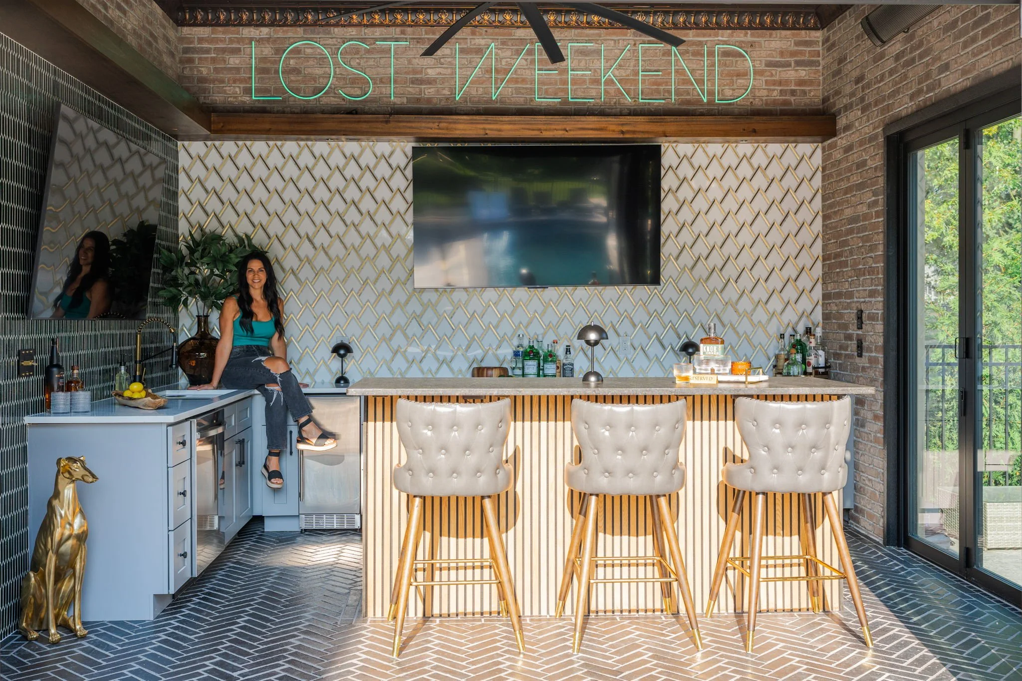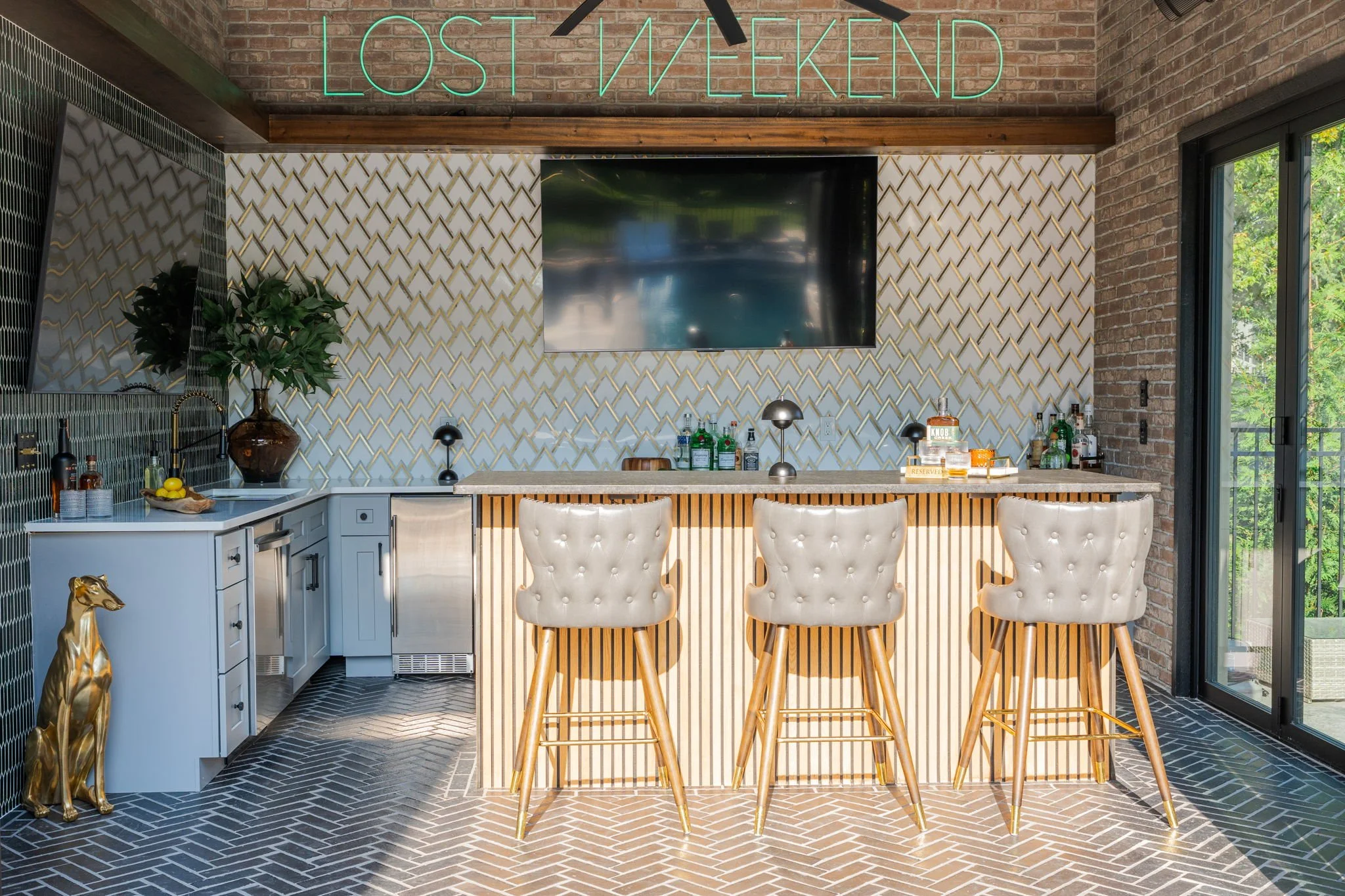 A playful yet refined backyard retreat that blends modern luxury with a dash of speak easy vibes. The custom bar pairs glossy emerald tile with gold-accented geometric backsplash for a vibrant, sophisticated contrast. Warm wood beams and herringbone flooring ground the space, while the neon “Lost Weekend” sign sets the mood for effortless entertaining. Completing the look — Goldie Hound, the loyal metallic guardian of this swanky escape.