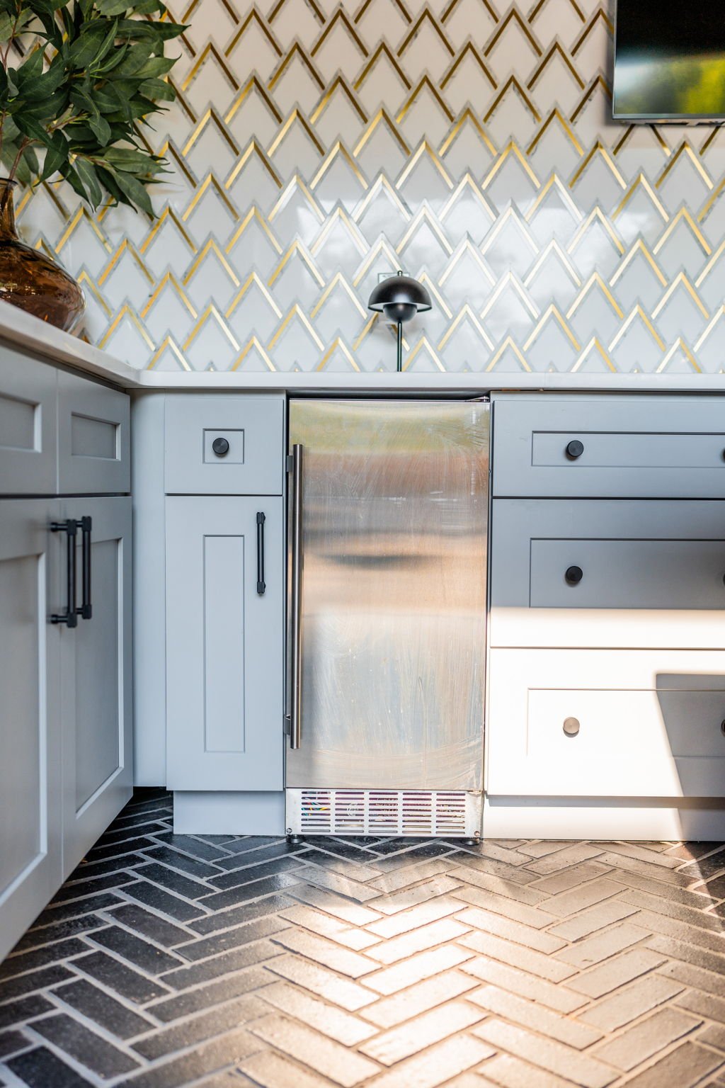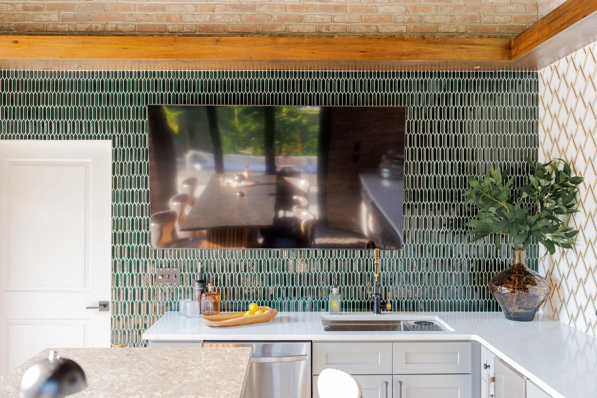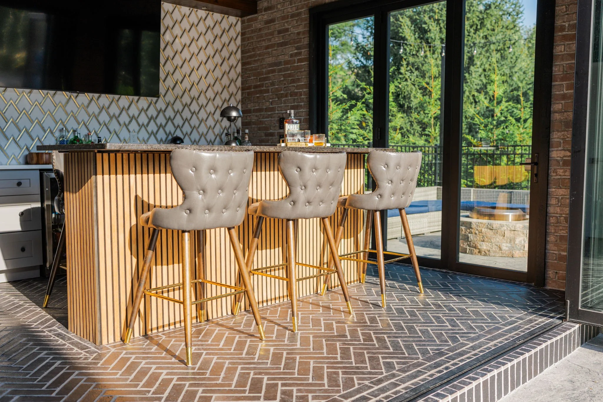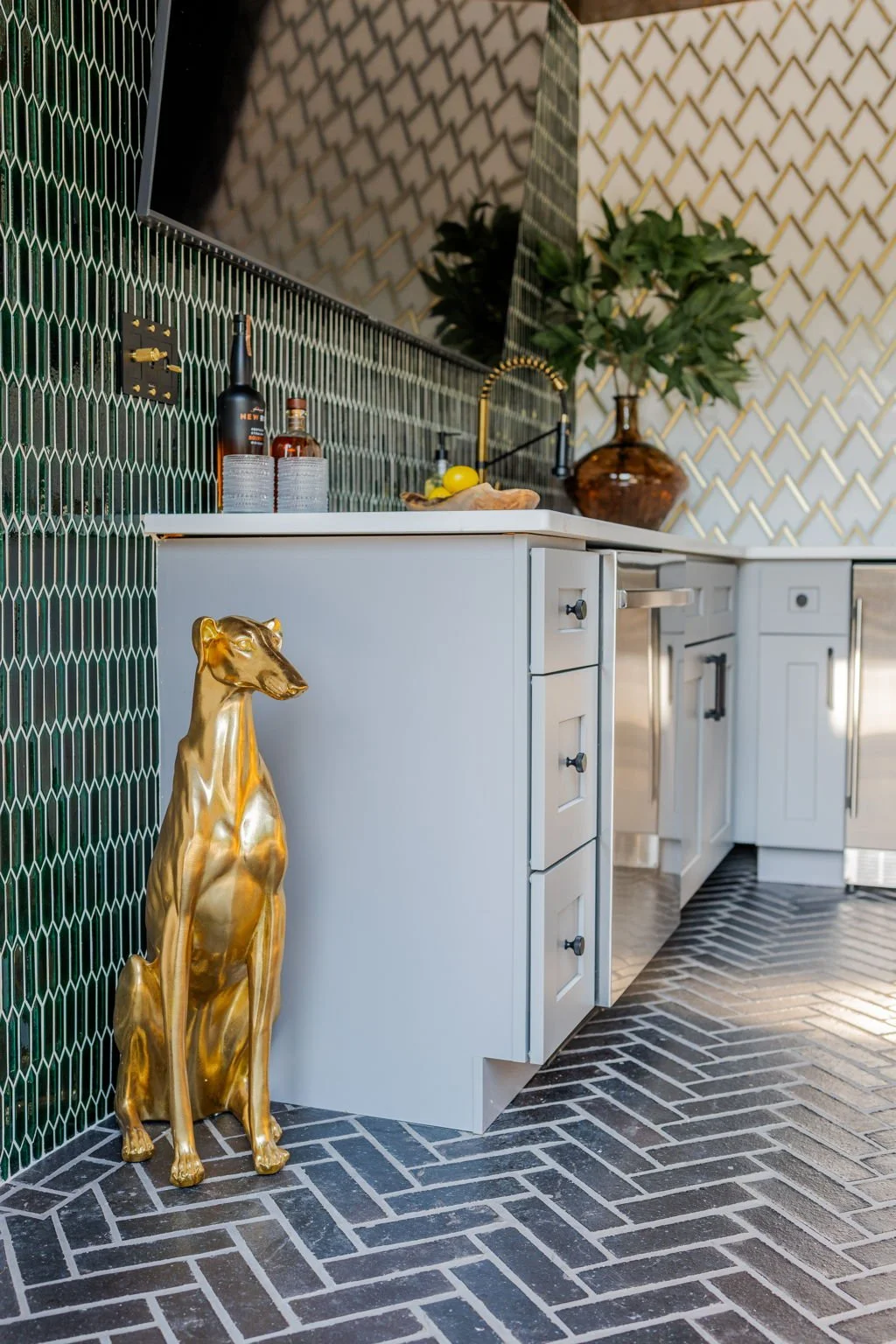 A playful yet refined backyard retreat that blends modern luxury with a dash of speak easy vibes. The custom bar pairs glossy emerald tile with gold-accented geometric backsplash for a vibrant, sophisticated contrast. Warm wood beams and herringbone flooring ground the space, while the neon “Lost Weekend” sign sets the mood for effortless entertaining. Completing the look — Goldie Hound, the loyal metallic guardian of this swanky escape.