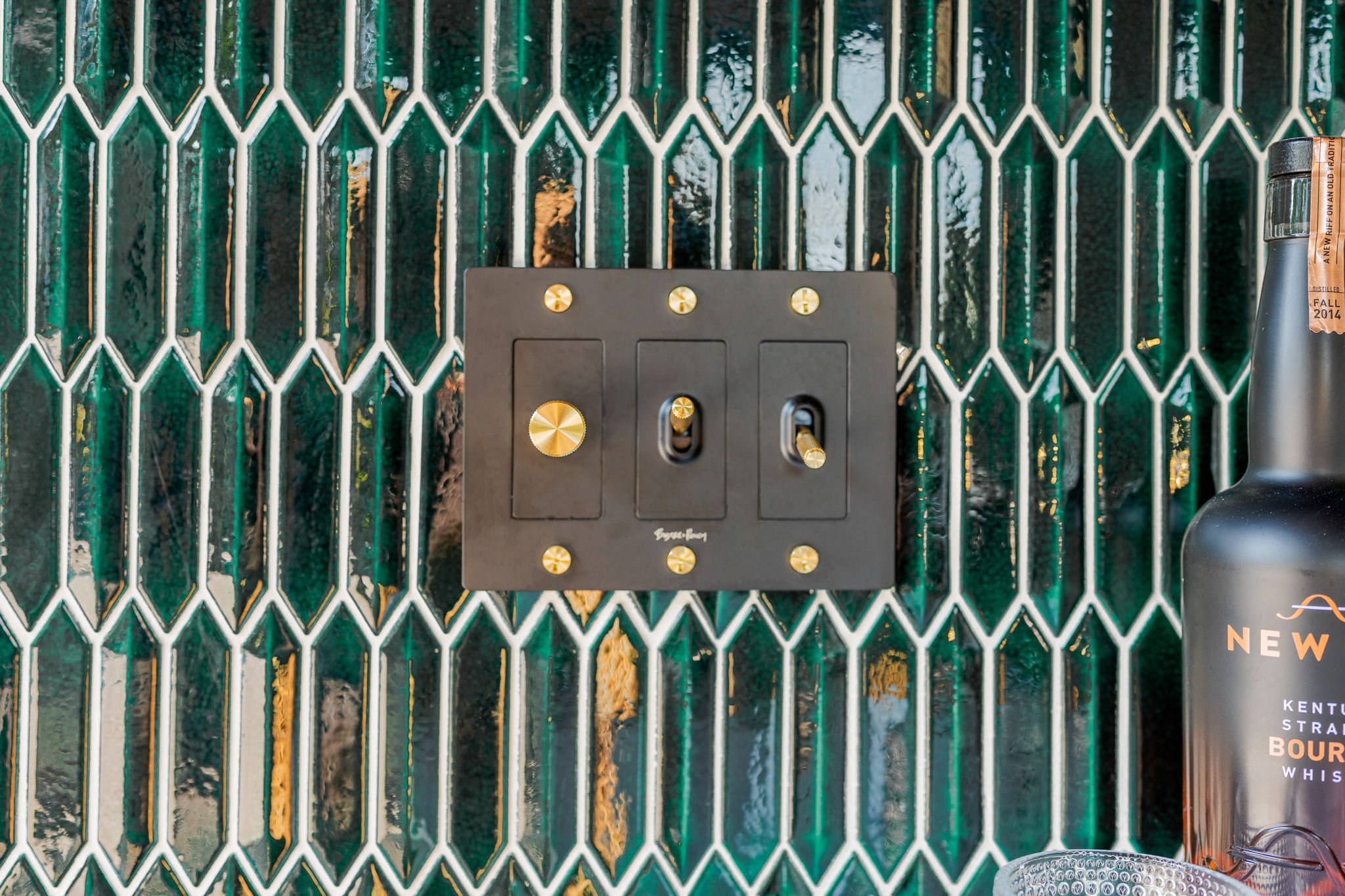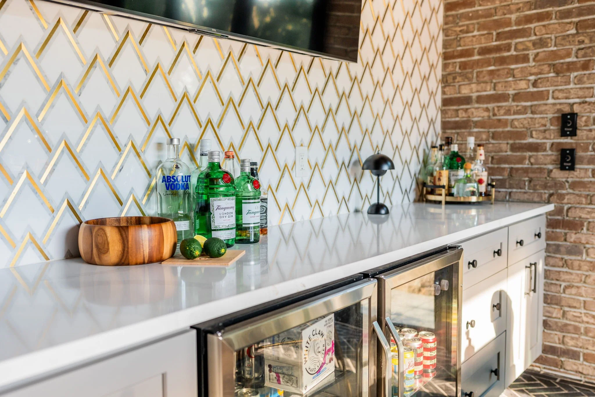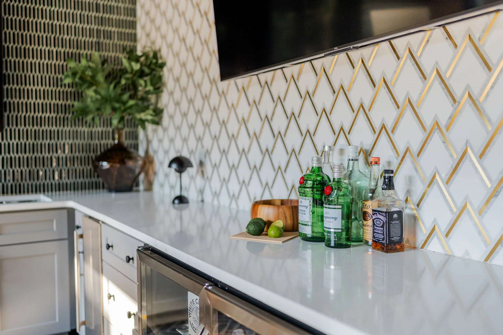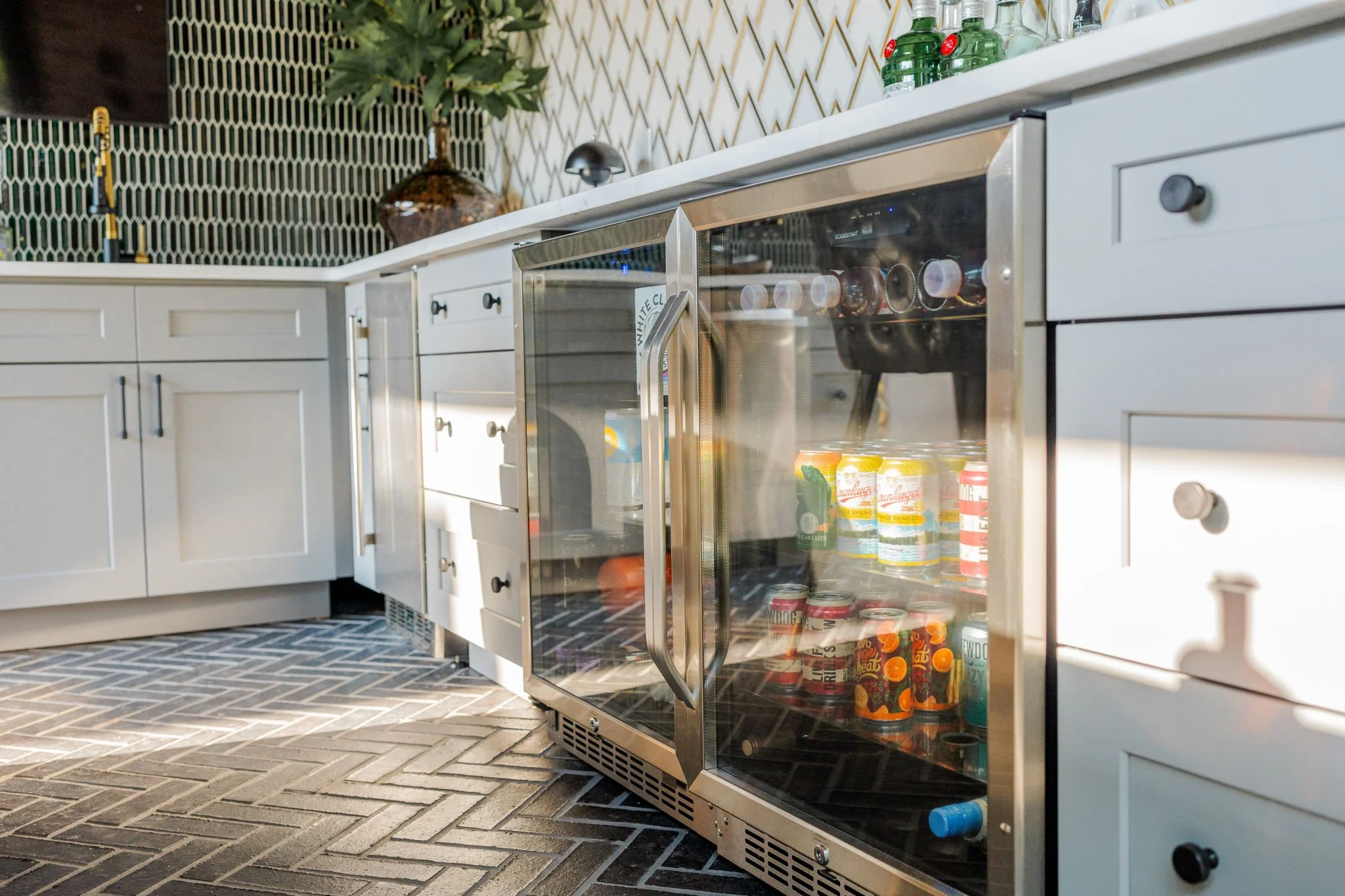 A playful yet refined backyard retreat that blends modern luxury with a dash of speak easy vibes. The custom bar pairs glossy emerald tile with gold-accented geometric backsplash for a vibrant, sophisticated contrast. Warm wood beams and herringbone flooring ground the space, while the neon “Lost Weekend” sign sets the mood for effortless entertaining. Completing the look — Goldie Hound, the loyal metallic guardian of this swanky escape.