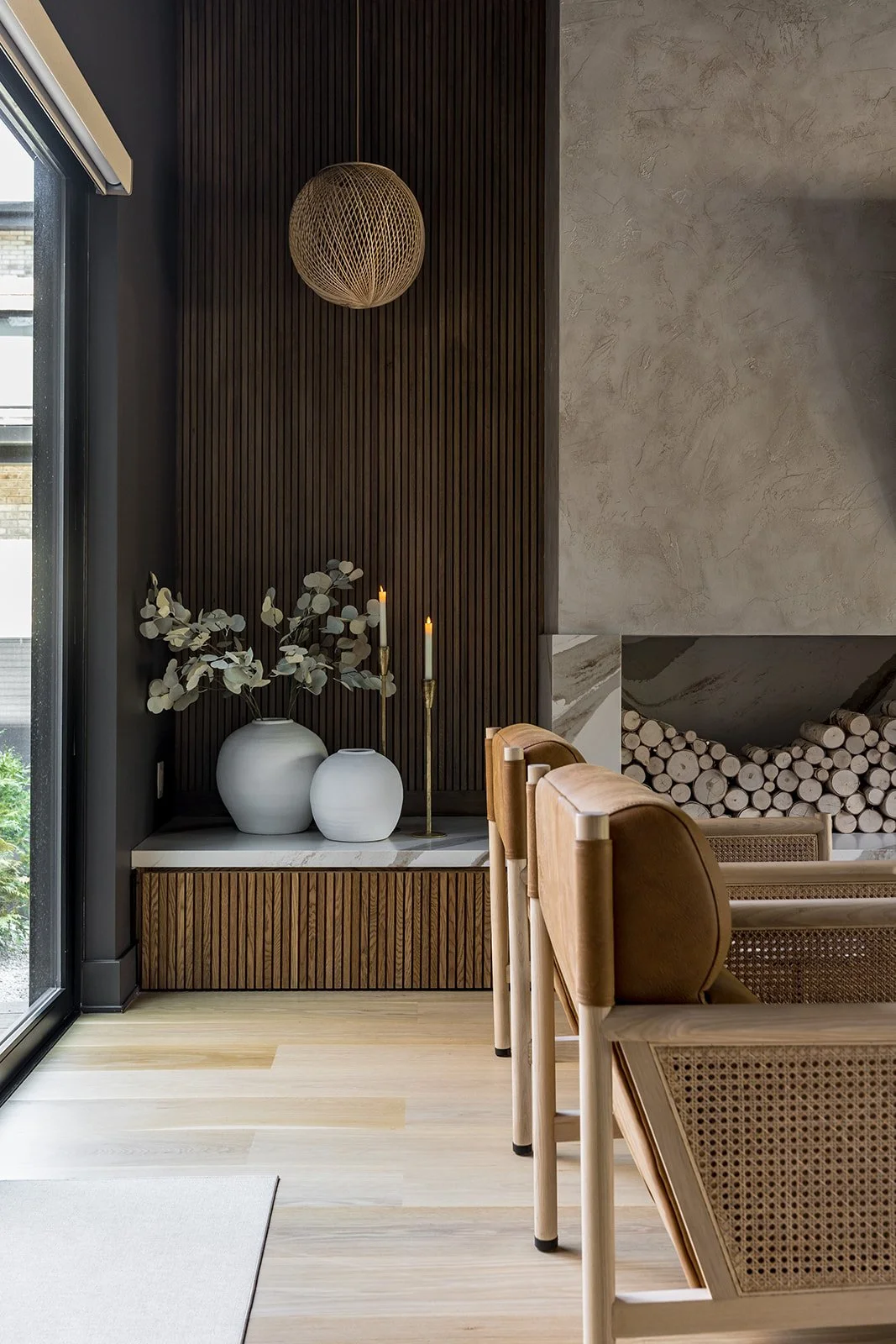 This home embodies organic sophistication-where soft natural light, tactile textures, and curated craftsmanship create a serene yet elevated living experience. From the sculpted marble kitchen to the cane-accented lounge and tranquil entryway, every space balances modern restraint with timeless warmth.